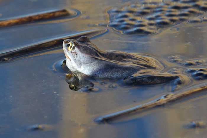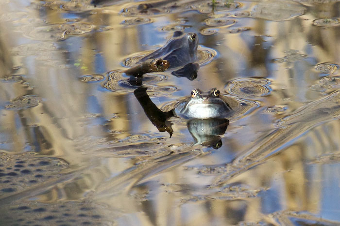 Viitasammakot kutemassa etelärannalla. Lajin tunnistaa koiraan pulputtavasta soidinäänestä. Kuvat: Pekka Turunen. Copyright © Pekka Turunen. (5.5.2016)