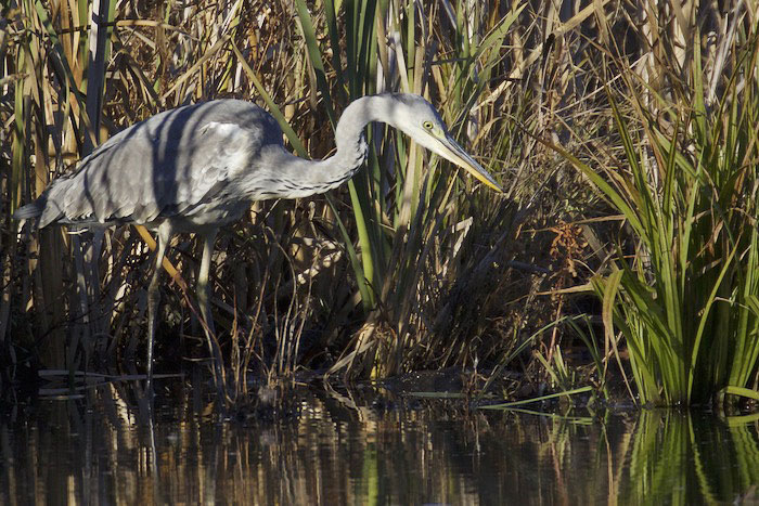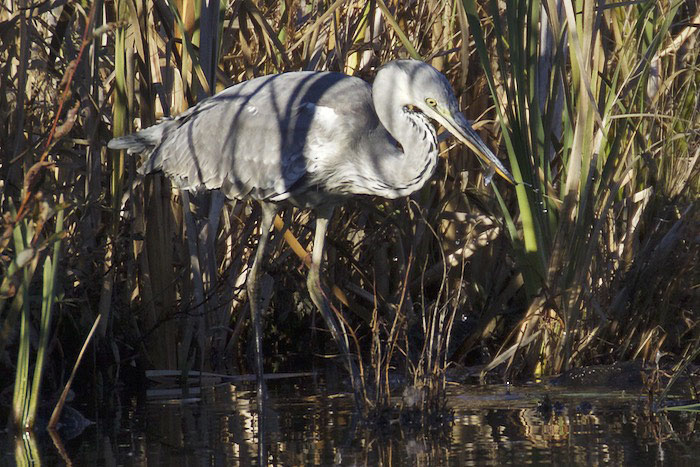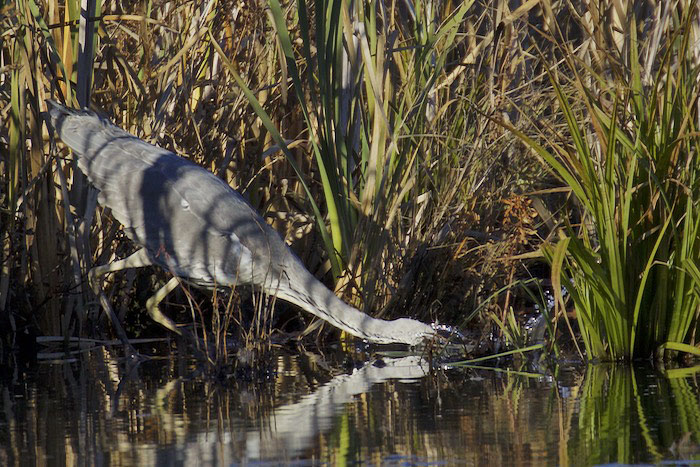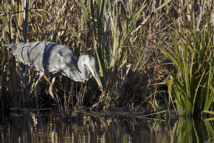 Harmaahaikara kalastaa Iidesjärven länsipäässä ja saa saaliiksi pikkukalan. Harmaahaikara väijyy rannalla liikkumattomana pitkiäkin aikoja ja odottaa kalan, sammakon tai muun pikkueläimen tulevan iskuetäisyydelle. Saalistavaa harmaahaikaraa on vaikea huomata, koska paikallaan seisova lintu sulautuu hyvin maastoon. Iidesjärvi, Tampere. Kuvat: Pekka Turunen. Copyright © Pekka Turunen. (11.10.2015)