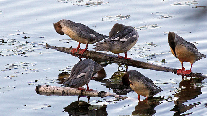 Isokoskelot huoltavat höyhenpeitettä kaatopaikan rannassa. Iidesjärvi, Tampere.
