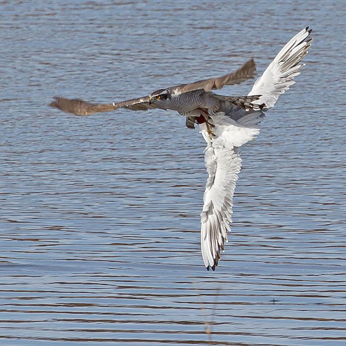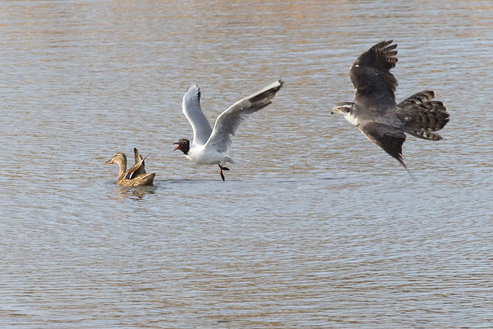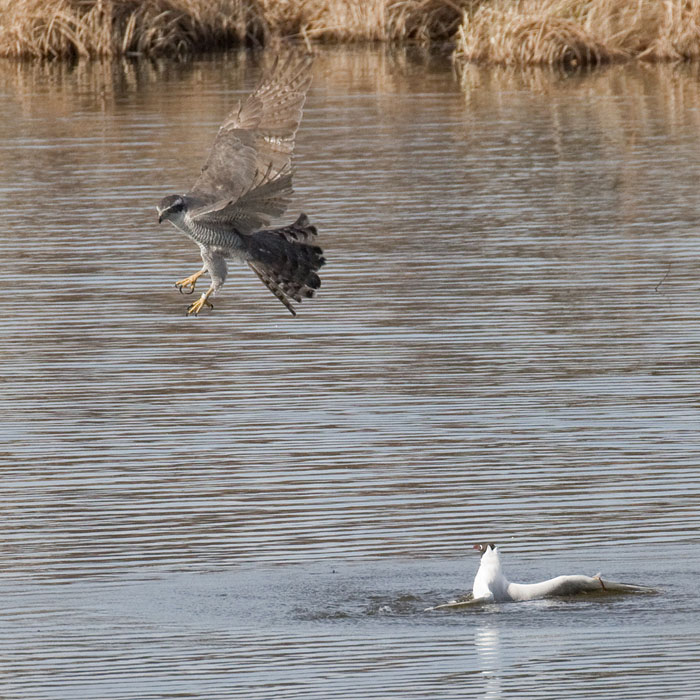Kun lokki yrittää lentoon, haukka iskee uudelleen. Kuvat: Pekka Turunen. Copyright © Pekka Turunen. (11.4.2015)
