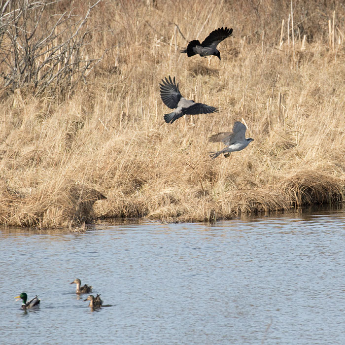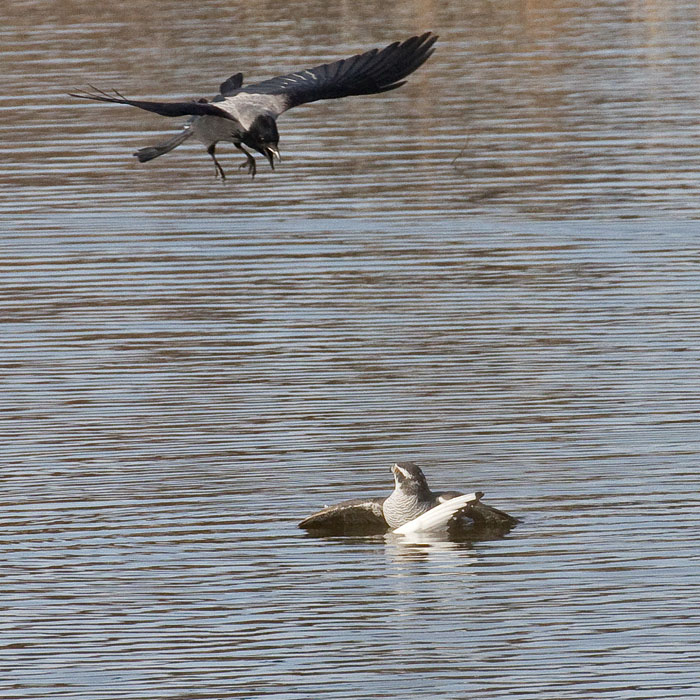 Iskun jälkeen haukka jättää lokin ja lentää lähistölle varisten ahdistelemana. Kuvat: Pekka Turunen. Copyright © Pekka Turunen. (11.4.2015)