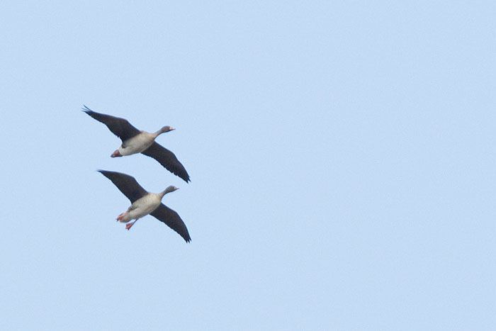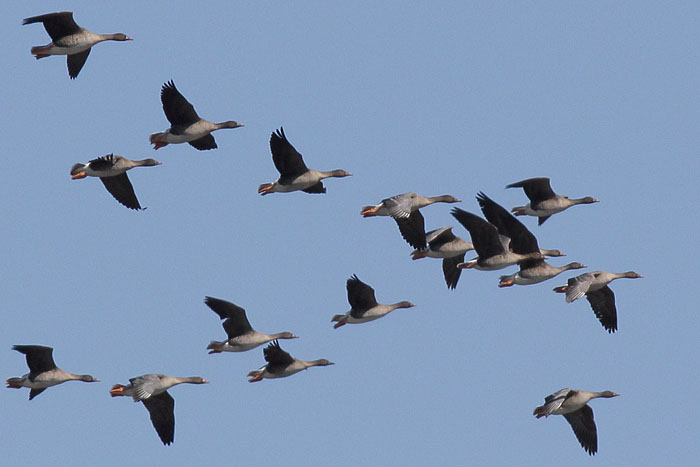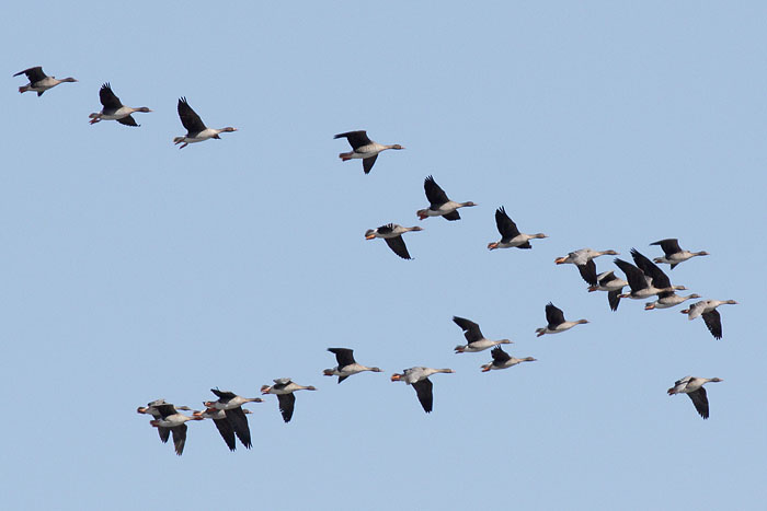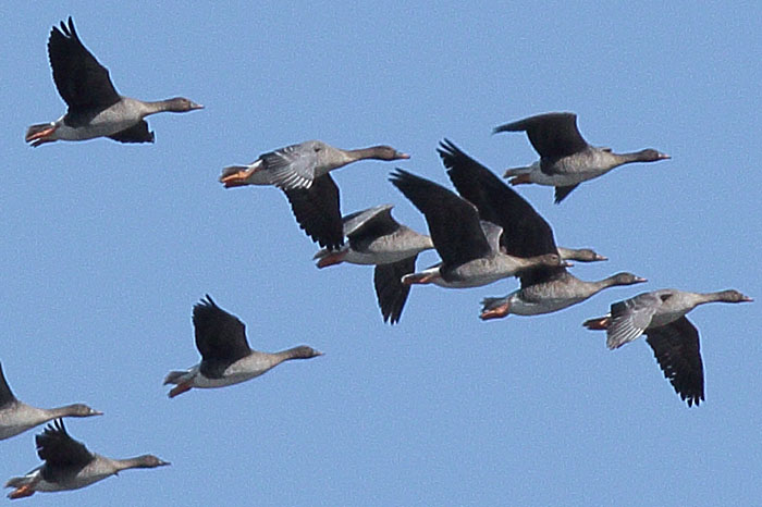 Kaksi rajattua kuvaa yllä olevasta noin 30 hanhen parvesta. Kuva: Olavi Autio. Copyright © Olavi Autio. (28.4.2013)