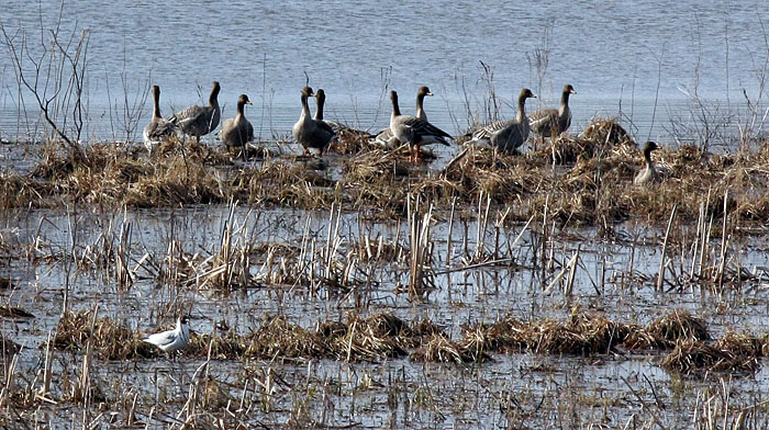 Metsähanhet levähtävät muuttomatkallaan Iidesjärven itäpään rantaniityllä. Iidesjärvi, Tampere. Kuva: Olavi Autio. Copyright © Olavi Autio. (25.4.2012)