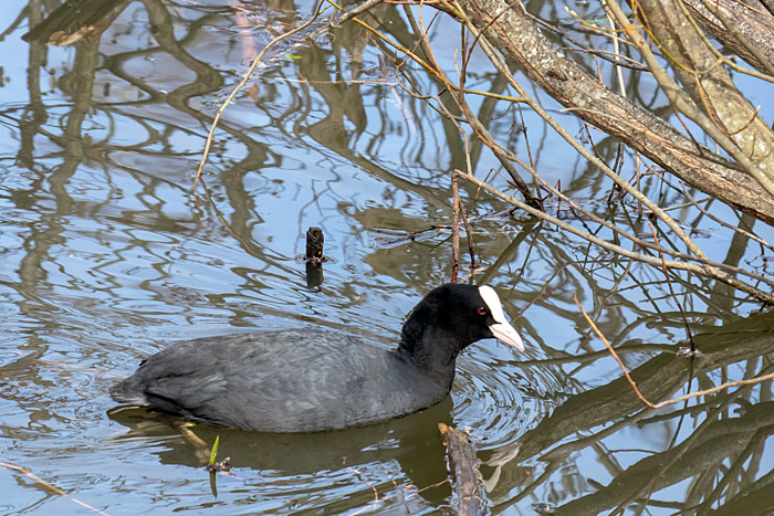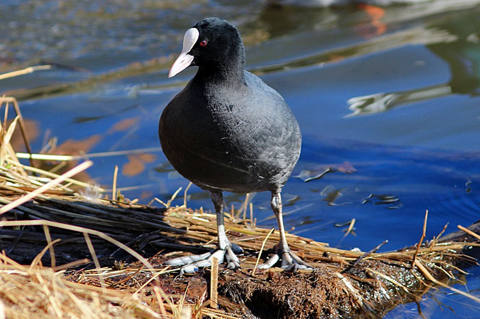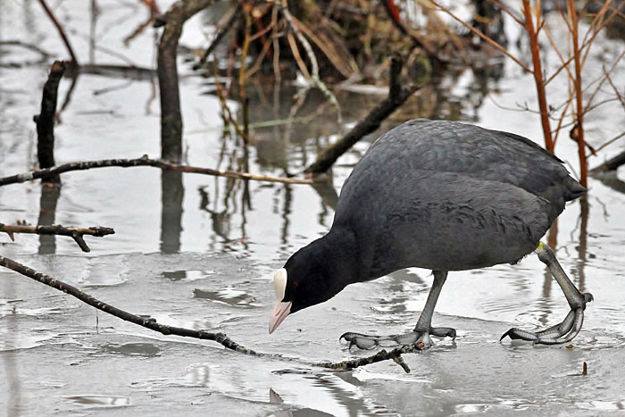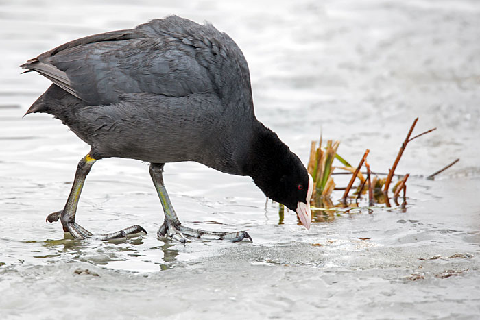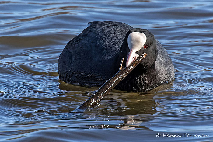 Nokikana keräilee pesänrakennusaineksia järven länsipäässä. Iidesjärvi, Tampere.
