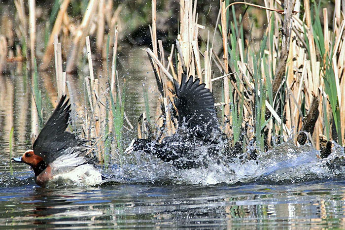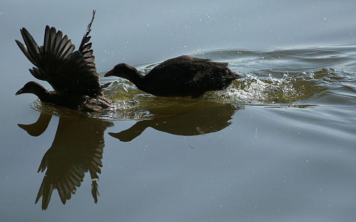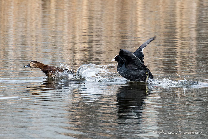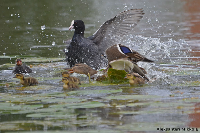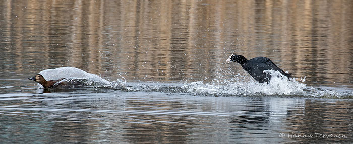 Nokikana ei ole helppo naapuri. Tässä haapana saa häädön reviiriltä. Iidesjärvi, Tampere.