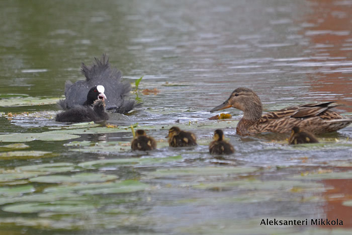 Nokikanan ja sinisorsan poikueet törmäyskurssilla järven länsipäässä. Iidesjärvi, Tampere.