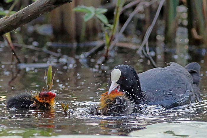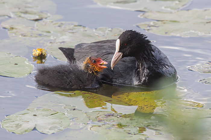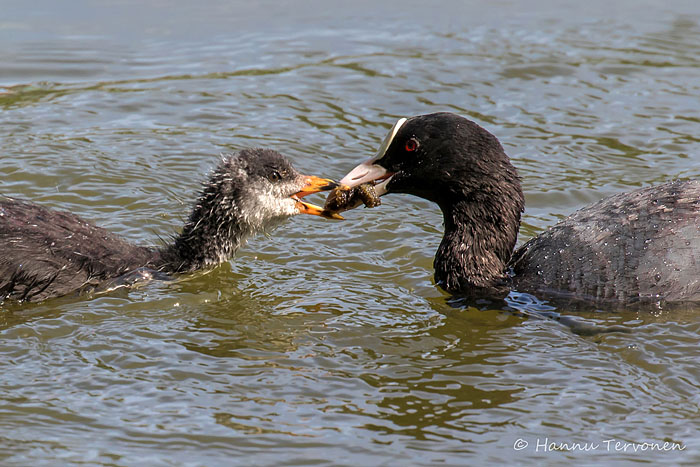 Nokikana ruokkii poikastaan järven länsipäässä. Iidesjärvi, Tampere.