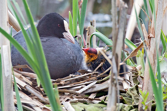 Nokikana ja poikanen järven länsipäässä. Iidesjärvi, Tampere.