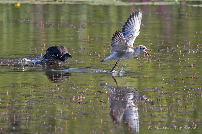 Nokikana ahdistelee nuorta naurulokkia järven länsipäässä. Iidesjärvi, Tampere.