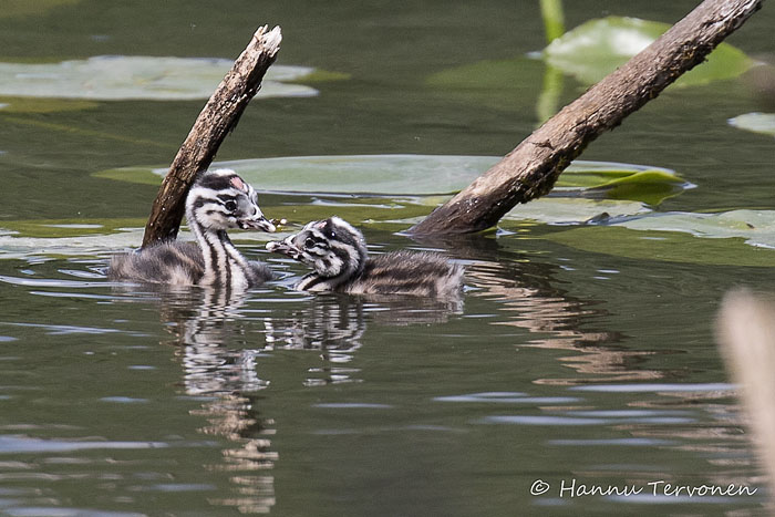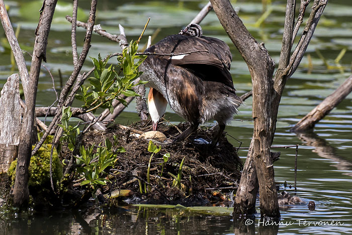 Silkkiuikku tutkii kuoriutumatonta munaa poikanen selässään. Iidesjärvi, Tampere. Kuva: Hannu Tervonen. Copyright © Hannu Tervonen. (17.6.2015)