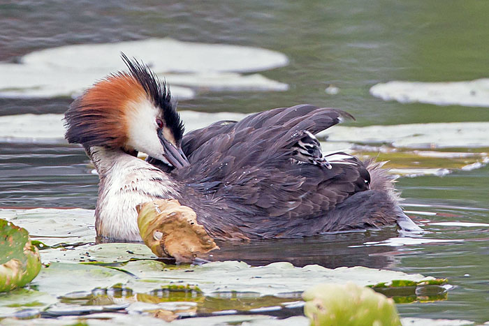 Myöhäinen silkkiuikun poikanen emon selässä järven länsipäässä. Näin myöhään kuoriutunut poikanen varttuu lentokykyiseksi vasta syys-lokakuussa. Iidesjärvi, Tampere. Kuva: Kari Jussila. Copyright © Kari Jussila. (22.7.2016)