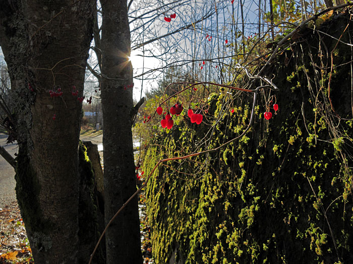 | Maisemakuvia vuodelta 2017  Vuohensillankadun reunamuuri syysauringossa. Punaiset marjat ovat punakoison marjoja. Iidesjärvi, Tampere. Kuva: Olavi Autio. Copyright © Olavi Autio. (7.11.2017)