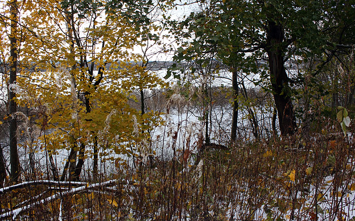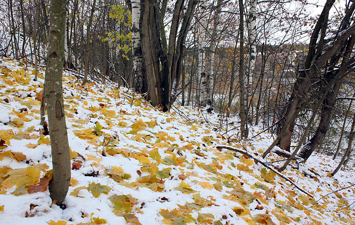 Vaahteranlehtiä kaatopaikan lumisella penkalla.