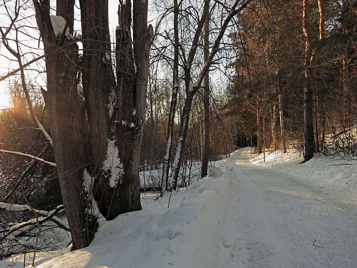 Aakkulanharjun kävelytie kevätauringossa. Iidesjärven laakso, Tampere.