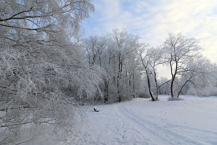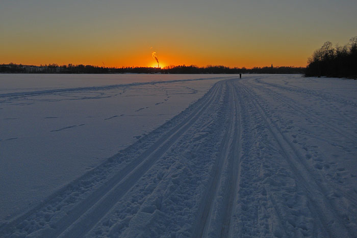 Auringonlasku hiihtoladulla pakkaskelillä. Iidesjärvi, Tampere.