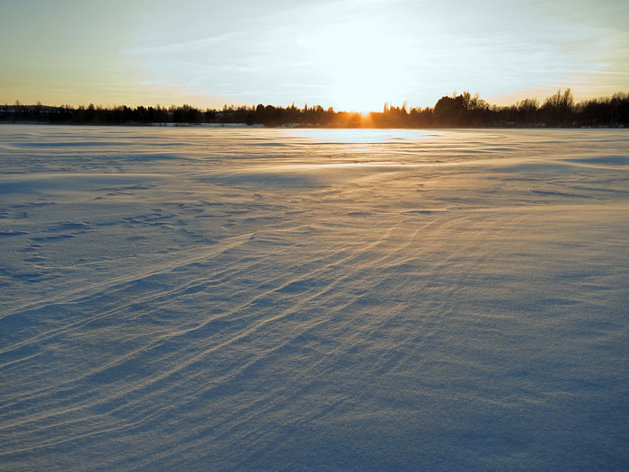 Tuuli on tehnyt lumesta aaltoja jäälle. Iidesjärvi, Tampere.