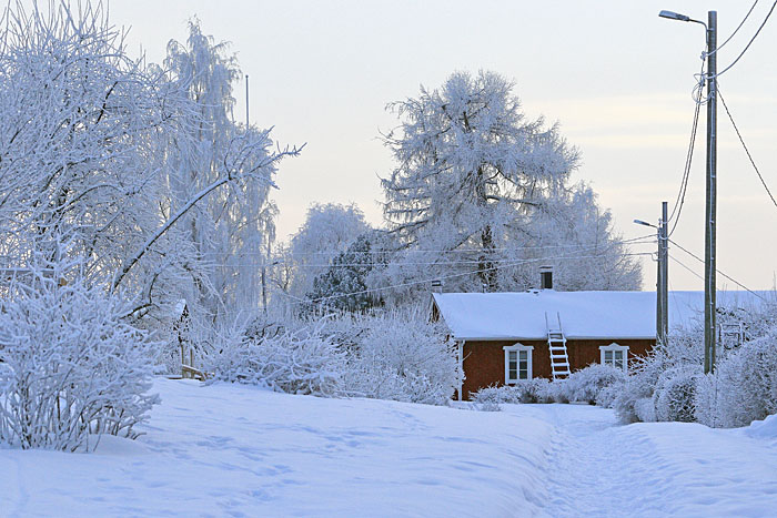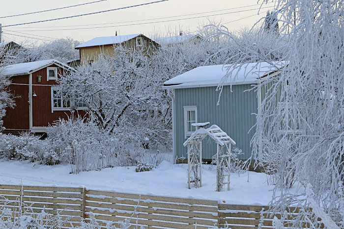 Nekalan siirtolapuutarhan talvea. Ylemmässä kuvassa Pirtti-rakennus. Iidesjärven laakso, Tampere.