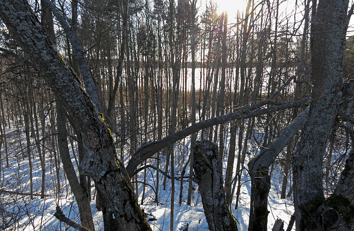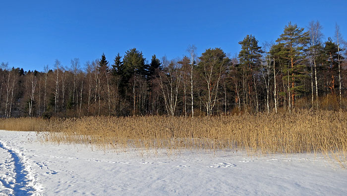 | Puhoonlahti ja metsikköPuhoonlahti (Puhhoonlahti) sijaitsee Iidesjärven koilliskulmassa Palvaanniemen pohjoispuolella. Järviruokoa kasvavan lahden pohjukassa on aikoinaan ollut niittyjä ja kookas laituri. Lahden rannassa on pieni metsikkö, joka on oikeastaan osa Kalevankankaan harjun (Kalevanharjun) metsää. Entisaikaan lahden pohjukasta oli suora yhteys harjulle. Liikenneväylien rakentaminen pirstoi reitin. Näitä väyliä ovat Tampereelta itään johtava rautatie, Järvensivuntie ja Iidesranta-katu. Erityinen vaikutus oli Iidesranta-kadun rakentamisella 1950-luvulla. Rakennustyö myllersi rantamaiseman ja jätti metsikön eristyksiin. Kuitenkin jonkinlainen yhteys Kalevankankaalle on edelleen olemassa. Rautatien aitakaan ei estä lintujen, hyönteisten ja pikkueläinten kulkua. Harjun etelärinne ja paahteinen radanvarsi tarjoavat hyönteisille hyviä asuinpaikkoja. Puhoonlahden pohjukan metsikkö Iidesjärven erikoisuus, koska siellä on mäntyjä ja jopa kelohonkia. Metsikkö on osittain kosteikko. Alueella on lähteitä, joista on ennen otettu talousvettäkin. Lähteistä tuleva vesi on nykyisin ruosteenvärisen liejun värjäämää. Alueelle on vuotanut myös jätevesiä kaupungin viemäriverkostosta. Metsikköön pääsee helposti Palvaanniemen puolelta. Palvaanniemenkadun pohjoispuolella sijaitsevan liikuntapaikan luota lähtee polku.   Puhoonlahden metsikkö on kuin pieni kaistale erämaata, kun maisemaa katsoo Iidesranta-kadun kevyen liikenteen väylältä. Kuva: Olavi Autio. Copyright © Olavi Autio. (2013)   Aurinkoisena kevätpäivänä Puhoonlahden pohjukka kerää valoa. Ruovikossa on lähteitä, joiden luona on talvellakin sulaa. Kuva: Olavi Autio. Copyright © Olavi Autio. (2013) |
