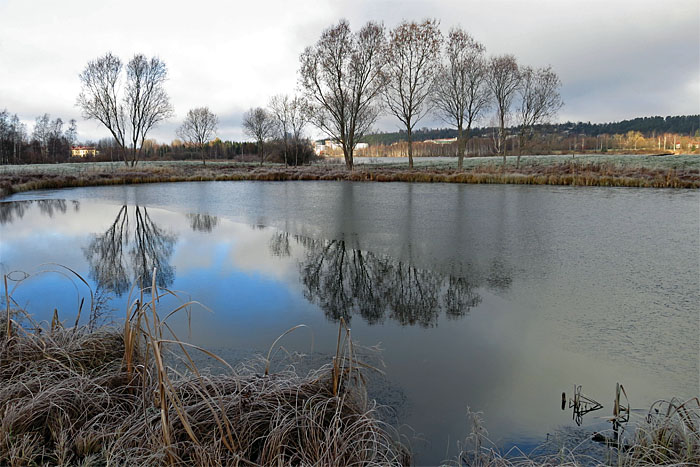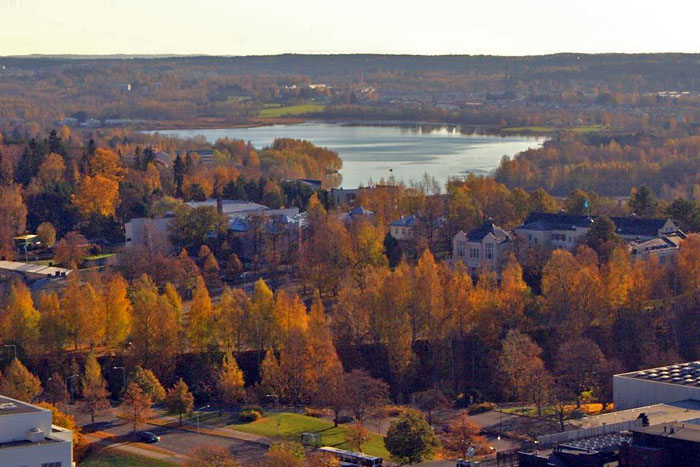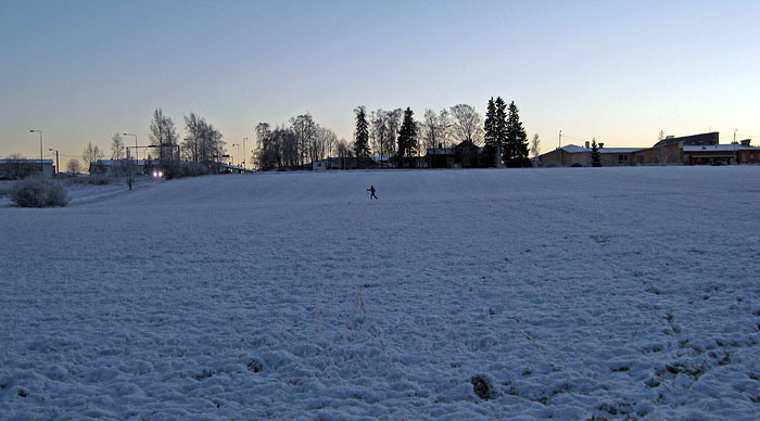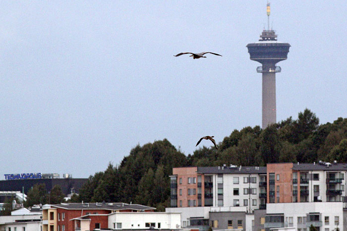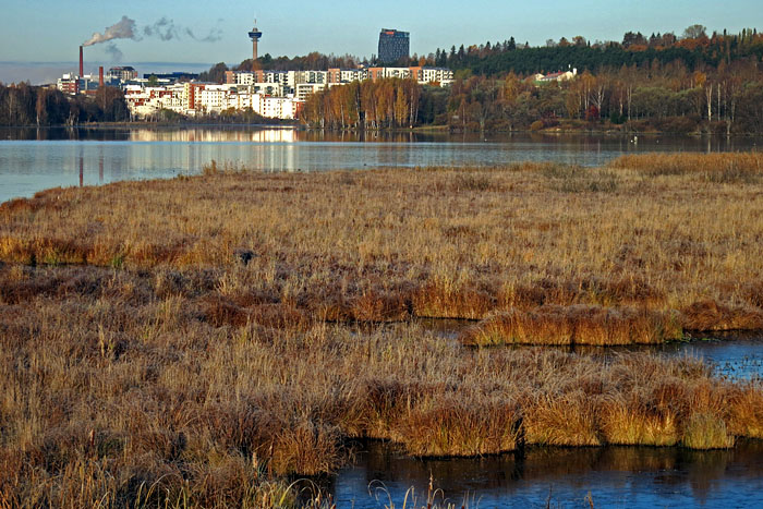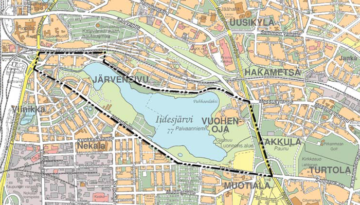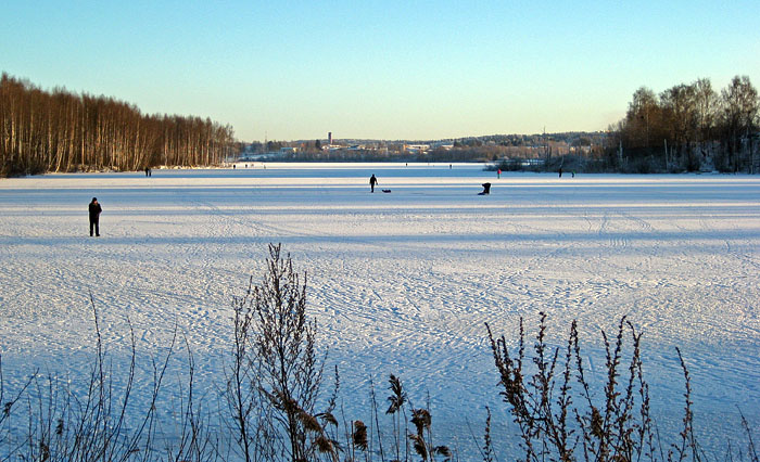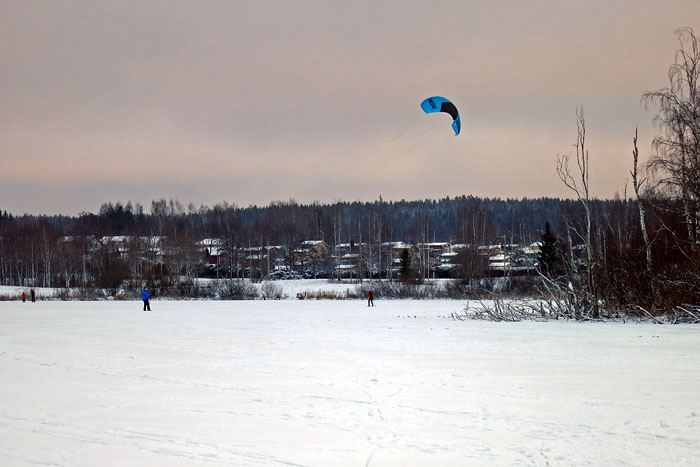 | Ajankohtaista Iidesjärveltä 2014Järvi tukevasti jäässä(Iides.fi 28.12.2014) Joulunseudun pakkaset jäädyttivät Iidesjärvelle tukevan jääkannen. Sunnuntaina 28. joulukuuta jäällä oli jo paljon kulkijoita: kävelijöitä, hiihtäjiä ja luistelijoita. Jää saattaa olla vielä vaarallisen heikkoa puronsuissa ja viemäriputkien lähellä.   Jos oma vauhti ei riitä, voi ottaa leijan vetoavuksi. Kuva: Olavi Autio. Copyright © Olavi Autio. (28.12.2014) Käännekohta lähestyy(Iides.fi 15.12.2014) Talvipäivänseisaus on maanantaina 22. joulukuuta, ja siihen saakka päivät lyhenevät. Talvipäivänseisauksen aikaan päivän pituus on Tampereella 5 tuntia ja 20 minuuttia. Aurinko nousee kello 9.42 ja laskee kello 15.03. Sääennusteiden mukaan talvipäivänseisauksen tienoo on pilvinen, joten luvassa on vuoden hämärin hetki. Siitä kannattaa nauttia! Pian valon määrä alkaa lisääntyä. Kolmen kuukauden kuluttua maaliskuussa päivä ja yö ovat jo tasoissa.   Aurinko laskee 14. joulukuuta. Kuva on otettu Iidesrannasta noin kello 14.40. Kuva: Olavi Autio. Copyright © Olavi Autio. (14.12.2014) Pikkukäpylinnusta tuli uusi suosikki(Iides.fi 3.12.2014) Kaunis ja peloton pikkukäpylintu on Iidesjärven luontokuvaajien uusi suosikki. Järven alueella on muutaman päivän ajan kierrellyt 10-20 linnun parvia, jotka suostuvat auliisti kuvattaviksi sopivilla ruokailupaikoilla. Pikkukäpylintu löytää murkinaa jopa pähkinähakkien tyhjentämistä makedonianmäntyjen kävyistä. Kuusissa parvi tekee selvää jälkeä. Ensin lintu katkaisee vahvalla nokallaan käpyä kannattavan hennon oksan ja vie kävyn sitten pilputtavaksi tukevammalle oksalle.   Pikkukäpylintua kuvataan joulukuisen iltapäivän hämärässä. Maata voi käyttää jalustana. Kuva: Olavi Autio. Copyright © Olavi Autio. (3.12.2014) Pensaikoissa on elämää hämärässäkin(Iides.fi 19.11.2014) Marraskuun hämärinä päivinäkin Iidesjärven rantapensaikoissa on elämää. Räkättirastaiden parvet tuovat kesän mieleen, vaikka räkätit ovatkin nyt kovin vaitonaisia. Pensaikkojen väriläiskiä ovat tiklit, viherpeipot ja sinitiaiset. Hyvällä onnella vastaan voi lennähtää pienen lumipallon näköinen lintu. Vikkelä pyrähtelijä on pyrstötiainen. Valokuvaajalle syksyinen hämärä on haaste ja mahdollisuus. Värimaailma on erilainen kuin kesällä. Käsivaraltakin saa kuvia, kun käyttää riittävän korkeaa herkkyyttä. Oheisissa kuvissa herkkyyden ISO-arvo on ollut 6400.   Ruusunmarjat maittavat viherpeipoille. Kuva: Olavi Autio. Copyright © Olavi Autio. (19.11.2014)   Itsestään lentävä lumipallo on pyrstötiainen. Kuva: Olavi Autio. Copyright © Olavi Autio. (19.11.2014) Rannat lunta tulvillaan(Iides.fi 7.11.2014) Perjantaina 7. marraskuuta Iidesjärven rannoille satoi puolen päivän aikaan toistakymmentä senttiä lunta. Rantapensaikot vaihtoivat äkisti talviasuun, mutta järvi pysyi sulana. Runsas lumentulo muutti kuitenkin järven pinnankin paikoin lumisohjoksi. Iltapäivällä lasten kiljunta pihoilla ja puistoissa paljasti, että pulkkamäkikausi oli avattu.   Etelärannan kävelypolku lumisateen jälkeen. Kuva: Olavi Autio. Copyright © Olavi Autio. (7.11.2014)   Iidesjärven maisema iltapäivällä Kalevanharjulta kuvattuna. Kuva: Olavi Autio. Copyright © Olavi Autio. (7.11.2014) Marraskuu yllätti valolla(Iides.fi 1.11.2014) Valoisa aika lyhenee päivä päivältä, ja luonto valmistautuu talveen. Illat sammuvat kylmään hämäryyteen, runoili Tove Jansson Syyslaulussaan (Esko Elstelän suomennos). Mutta jos sää on suosiollinen, musta marraskuu saattaa tarjota kuulaimmat syyspäivät. Sellainen päivä oli pyhäinpäivä 1. marraskuuta. Aurinko sai kuuraiset kasvit ja riitteen peittämät vesilätäköt hohtamaan valoa. Iidesjärven alueen kävelyteilläkin riitti luonnosta nauttivia kulkijoita.   Hevoshaan lampi marraskuun kuulaana syyspäivänä. Kuva: Olavi Autio. Copyright © Olavi Autio. (1.11.2014)   Tikli marraskuun valossa. Kuva: Olavi Autio. Copyright © Olavi Autio. (1.11.2014) Asemankorkee on uusi maamerkki(Iides.fi 19.10.2014) Rautatieaseman ratapihan reunalle rakennettu lähes 90 metriä korkea hotelli on uusi Iidesjärven maamerkki, jonka avulla lintuharrastajat määrittelevät sijainteja ja suuntia lintutornilla. Muita maamerkkejä ovat esimerkiksi Pyynikin näkötorni, Takon piippu, Näsinneula ja Kalevankankaan hautausmaan kukkula. Hotellin virallinen nimi on Solo Sokos Hotel Torni. Osuvampi nimi olisi voinut olla vaikkapa hotelli Korkee. Korkee tarkoittaa Tampereen seudulla ja muuallakin Suomessa korkeaa paikkaa. Esimerkiksi Tampereen korkein paikka (211 m) Pohjois-Teiskossa on nimeltään Koskelankorkee. Uusissa kartoissa nimi on kuitenkin sievistelty muotoon Koskelankorkea. Tornihotellista avautuu hyvä näköala Iidesjärvellekin. Lintuharrastajat voivat nyt tarkkailla siivekkäitä vaikkapa baaritiskiltä. Etäisyyttä järvelle on vain runsas kilometri. Näköalaa voi ihailla myös verkon välityksellä Flycam Oy:n Skyview Liven avulla.   Uusi hotelli erottuu mustana Iidesjärven maisemassa. Kuva on otettu lintutornilta. Kuva: Olavi Autio. Copyright © Olavi Autio. (18.10.2014)   Hotellin katolta Skyview Live -kameralla otettu kuva. (18.10.2014) Uivelot ovat täällä taas(Iides.fi 17.10.2014) Lintujen syysmuutto tuo Iidesjärvelle paljon vieraita. Yksi vakiovieras on Lapin ja Pohjois-Suomen lintu uivelo, jolle järvi tarjoaa levähdys- ja ruokailupaikan. Lintu on niin harvinainen, että ohi lentävää uiveloa on syytä tervehtiä ottamalla pipa pois päästä. Maassamme pesii pari tuhatta uiveloparia, mikä on neljäsosa Euroopan uivelokannasta. Iidesjärvelläkin uiveloita on syksyisin yleensä vain muutaman linnun parvina. Naaraspukuinen uivelo muistuttaa hiukan isokoskeloa. Uivelo on kuitenkin selvästi isokoskeloa pienempi. Uivelon kurkku on valkea, kun isokoskelolla kurkku on tumma.   Uivelot lennossa etelärannan tuntumassa. Kuva: Olavi Autio. Copy
