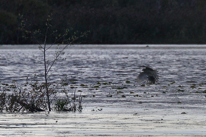 Kanahaukka raahaa iltahämärässä saalistaan järven pinnassa kohti Hevoshakaa. Kuva: Olavi Autio. Copyright © Olavi Autio. (25.9.2018)