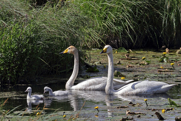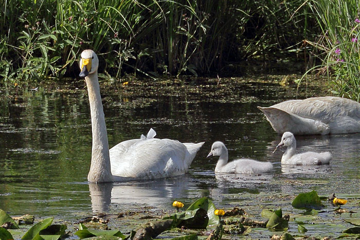 Laulujoutsenilla kolme poikasta(Iides.fi 8.6.2018) Iidesjärven laulujoutsenpariskunnalla on kolme poikasta. Hannu Tervonen kuvasi poikaset perjantaina 8. kesäkuuta järvenselällä lintutornin edustalla. Pesintä näytti jo epäonnistuneen, koska molemmat joutsenet liikkuivat yhtä aikaa järvellä kaukana pesäpaikasta. Pesintä on kuitenkin onnistunut!   Laulujoutsen ja kolme poikasta lintutornin edustalla. Kuva: Hannu Tervonen. Copyright © Hannu Tervonen. (8.6.2018)