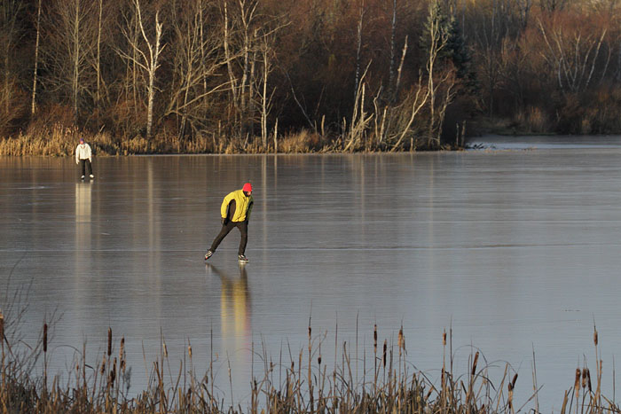 Luistelijat ja pilkkijät järvelle(Iides.fi 1.12.2018) Iidesjärven vuodenkierto etenee kohti talvea. Lauantaina 1. joulukuuta järvellä ei enää näkynyt vesilintuja eikä veneilijöitä. Pakkasen synnyttämä jääkansi kannatti jo pilkkijöitä ja luistelijoita. Ja sitten pari ajankohtaista varoituksen sanaa! Ohut syysjää on tarkoitettu kokeneille jäällä kulkijoille. Heidänkin kannattaa varoa, sillä purojen, ojien ja viemäreiden kohdalla järven jää voi olla vaarallisen heikkoa.   Luistelijoita Hevoshaan rannan tuntumassa. Kuva: Olavi Autio. Copyright © Olavi Autio. (1.12.2018)