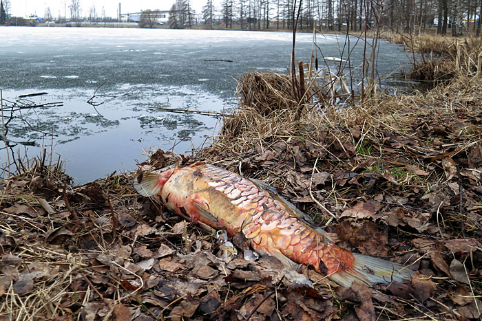 Pahalammella kuolleita kaloja(Iides.fi 17.4.2018) Pahalammella on koettu talven aikana ekokatastrofi. Pieni ja matala lampi ei ole kyennyt toimimaan suuren kalamäärän elinympäristönä, mikä on johtanut kalojen joukkokuolemaan. Kuolleita kaloja on runsaasti lammen rannoilla. Lammen jäällä lepäilee ylensyöneitä lokkeja. Pahalampi on entistä kaatopaikka-aluetta. Kalojen joukkokuolema voi johtua ympäristömyrkyistä tai happikadosta - tai molemmista. Ravinnekuormaa lammella on ollut vähintäänkin riittävästi, sillä rantapoluilla on ollut paljon koirien ulosteita. Karpit saattavat olla yksi syy happikatoon. Pahalammelle on tuotu karppeja virkistyskalastajien tarpeisiin. Ehkä lampi ei ole kestänyt pohjaa tonkivan vieraslajin aiheuttamaa kuormaa.   Tämä Pahalampeen tuotu karppi ei enää osallistu virkistyskalastukseen. Kuva: Olavi Autio. Copyright © Olavi Autio. (17.4.2018)