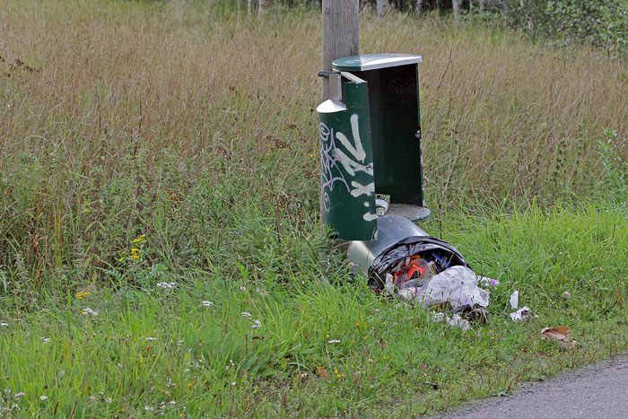 Se on täytetty, jopa ylitetty. Roskasäiliö kävelytien varrella Iidesjärven itäpäässä. Kuva: Olavi Autio. Copyright © Olavi Autio. (26.8.2018)