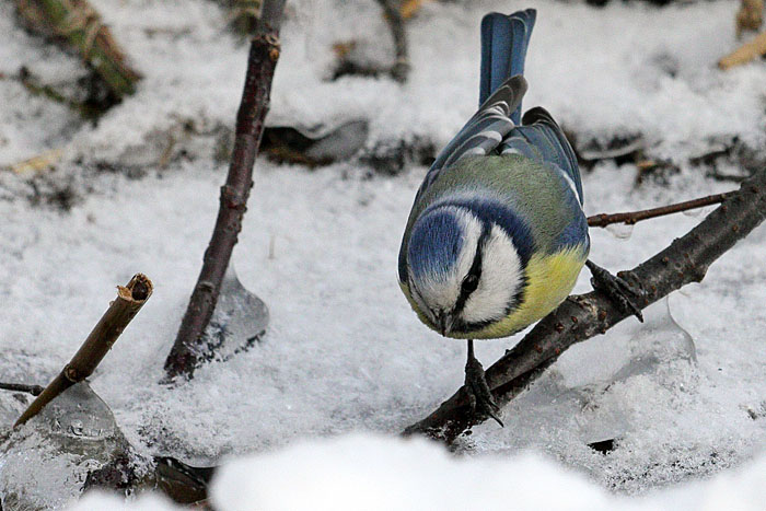 Tarkkasilmäinen lintu löytää vuotovesikosteikosta ruokaa pakkasellakin. Tässä sinitiainen silmä tarkkana Iidesrannassa. Kuva: Olavi Autio. Copyright © Olavi Autio. (17.2.2018)