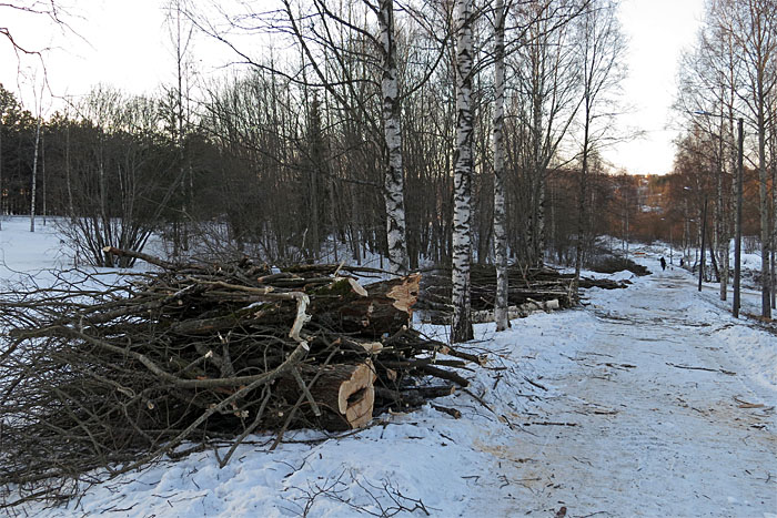 Puiden poistaminen luonnosta kiihdyttää myös ilmaston lämpenemistä, todistelevat oppineet. Tällä saralla olisi vielä paljon tehostettavaa, sillä kevät on ollut kylmä. Puut poikki ja pinoon!   Hakkuutyömaa laakson etelärinteellä Turtolassa. Kuva: Olavi Autio. Copyright © Olavi Autio. (7.3.2018)