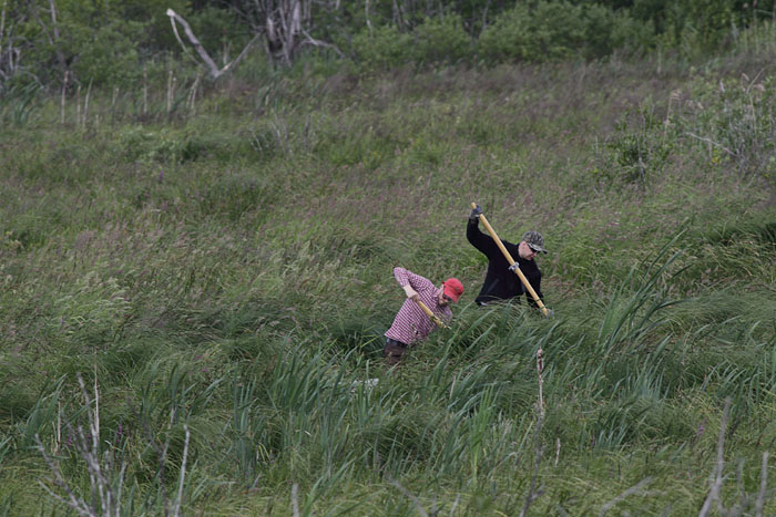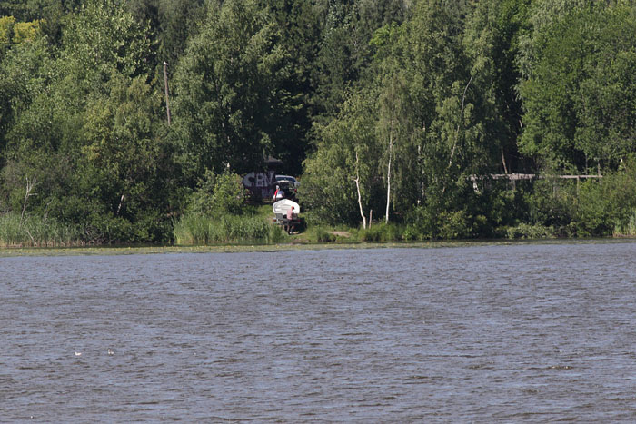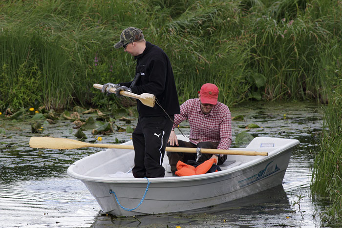 Veneilijät nostavat venettään Nekalan matonpesupaikan luona. Emoistaan erilleen joutuneet laulujoutsenen poikaset näkyvät vasemmassa alakulmassa. Kuva: Olavi Autio. Copyright © Olavi Autio. (20.6.2018)
