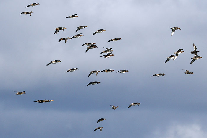 Vesilinnut suojautuvat ilmaan(Iides.fi 26.9.2018) Syksyisin huomaa, että Iidesjärvi tarjoaa turvapaikan monelle vesilinnulle. Petolinnun ylilento tai muu häiriö nostattaa yhtäkkiä satojen vesilintujen sekaparven pyörimään järven ilmatilaan. Vaaran ilmaantuessa vesilinnut suojautuvat ilmaan. Pallona pyörivään parveen petolinnun on vaikea iskeä. Kun vaara on ohi, linnut laskeutuvat eri puolille järveä. Pakolento kestää usein vain lyhyen hetken. Poukkoilevan parven tarkkailu paljastaa, että taitavakaan metsästäjä ei kykenisi ampumaan tähdättyä laukausta parvessa lentävään yksittäiseen lintuun. Siksi sorsajahdissa ammutaan paljon rauhoitettujakin lajeja. Vesilinnun pitää olla varovainen, muuten se ei selviydy. Tiistaina 25. syyskuuta järvellä räpiköi iltahämärässä outo yhdistelmä kohti Hevoshaan rantaa. Ilmeisesti jokin vesilintu ei ollut varovainen vaan joutui kanahaukan iltapalaksi. Saalis oli niin painava, että kanahaukka kykeni kuljettamaan sitä ilmassa vain lyhyen matkan kerrallaan.   Vaaraa paennut vesilintuparvi ilmassa. Kuvassa vain pieni osa parvesta. Suurin osa linnuista on haapanoita, mutta joukossa on myös lapasorsia ja taveja. Oikeassa reunassa näkyvä mustavalkoinen lintu on tukkasotka. Kuva: Olavi Autio. Copyright © Olavi Autio. (25.9.2018)
